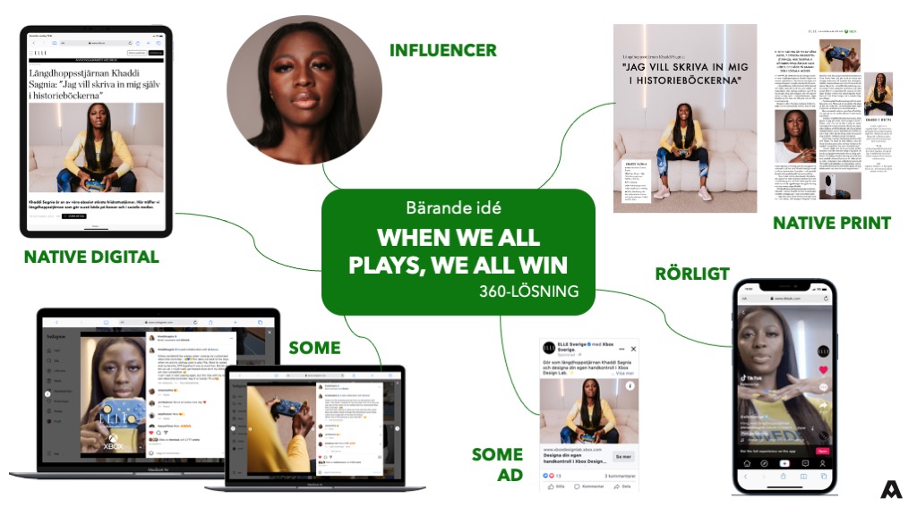 För att få fler kvinnor att upptäcka Xbox magiska spelvärld tog Aller Medias Creative Studio tillsammans med Xbox fram kampanjen When we play, we all win. Budskapet för kampanjen var tydligt: Alla kan spela! Och med en egen designad handkontroll - kan du samtidigt visa vem du är. Därför valde vi att samarbeta med den svenska längdhopparen Khaddi Sagnia. Vi ville visa hennes storhet som en av Sveriges främsta stjärnor inom svenskfriidrott genom att skapa en specialdesignad handkontroll med Xbox Design Lab - i Sveriges färger.