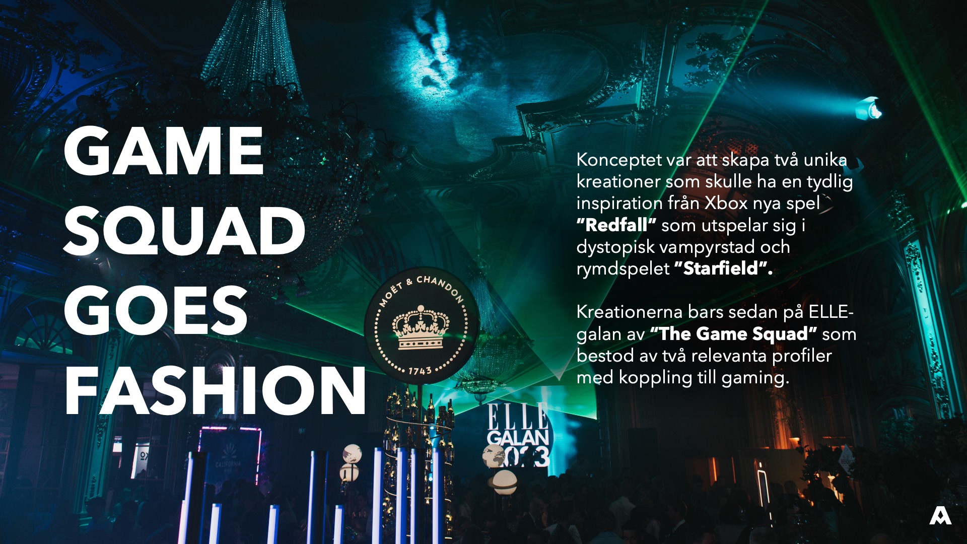 Genom samarbetet med Beckmans designhögskola lät vi två designstudenter tolka de två nya spelnyheterna från Xbox (Redfall och Starfield) och skapa unika kreationer som sedan bars på Elle-galan. Givetvis tog vi även ut kreationerna i ett modeuppslag i print och på sociala medier. Tack vare detta upplägg uppnådde vi en ny kreativ höjd för en annonskampanj. Att dessutom kunna lyfta två kvinnliga aspirerande modeskapare i ELLE känns som en fantastisk bonus.