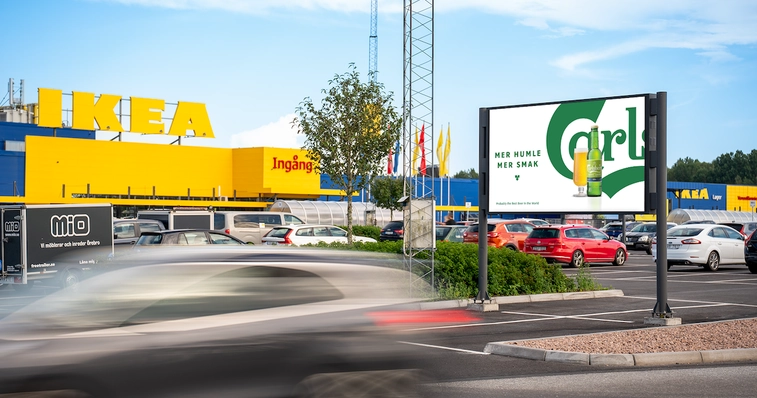 Dubbelsidig skärm placerad på IKEAs parkering på Mariebergs handelsplats. Här når ni alla besökare till IKEA och närliggande Willys.