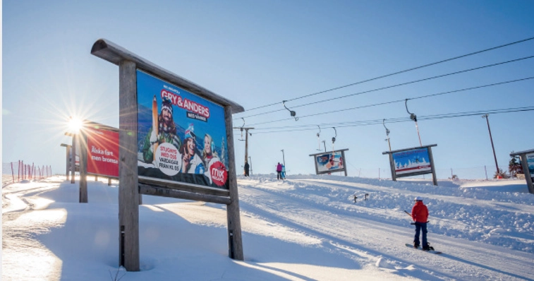 Välkommen att synas på stortavlor placerade vid SkiStars mesttrafikerade liftar, parkeringar och infarter. SkiStars gästerbefinner sig under sin skidsemester i en lugn och i övrigt brusfrifjällmiljö.