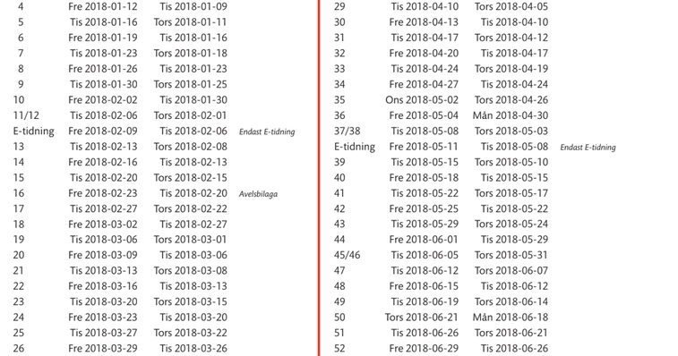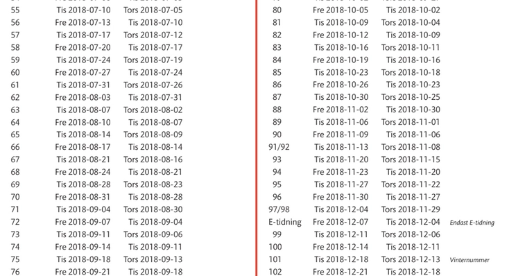 OBS! Detta är ett preliminärt utgivningsschema. Justeringar kan ske, främst kring jul och nyår. *Datumen för temanummer är preliminära.2